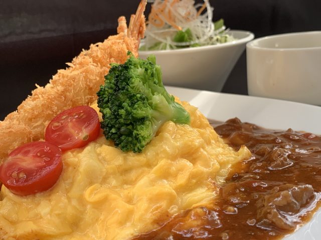トロトロたまごのハヤシライスに大きなエビフライを添えて!