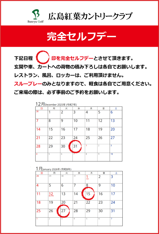 完全セルフデー始めます♪日程カレンダー(スループレーのみとさせて頂きます。) Posted on 2025年11月1日2025年11月29日 By h-kouyouPosted in お知らせ 下記日程を完全セルフデーとさせて頂きます。 2025年 12/31(水) 2026年 1/15(木)、1/27(火)、2/2(月)、2/16(月) 玄関や車、カートへの荷物の積み下ろしは各自でお願いします。 レストラン、風呂、ロッカーは、ご利用頂けません。 スループレーのみとなりますので、軽食は各自でご用意ください。 ご来場の際は、必ず事前のご予約をお願いします。