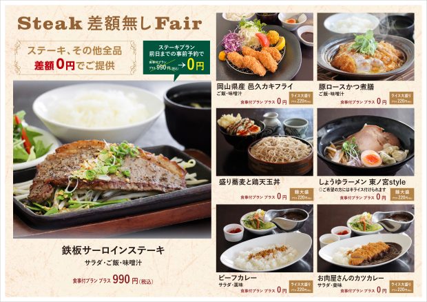 【期間限定】ステーキなしなしフェア Posted on 2025年12月1日2025年12月20日 By 東ノ宮カントリークラブPosted in お知らせ 【ステーキなしなしフェア】 12/22~12/26期間限定 ※すべてのメニューが差額なしでお召し上がりいただけます(^^♪