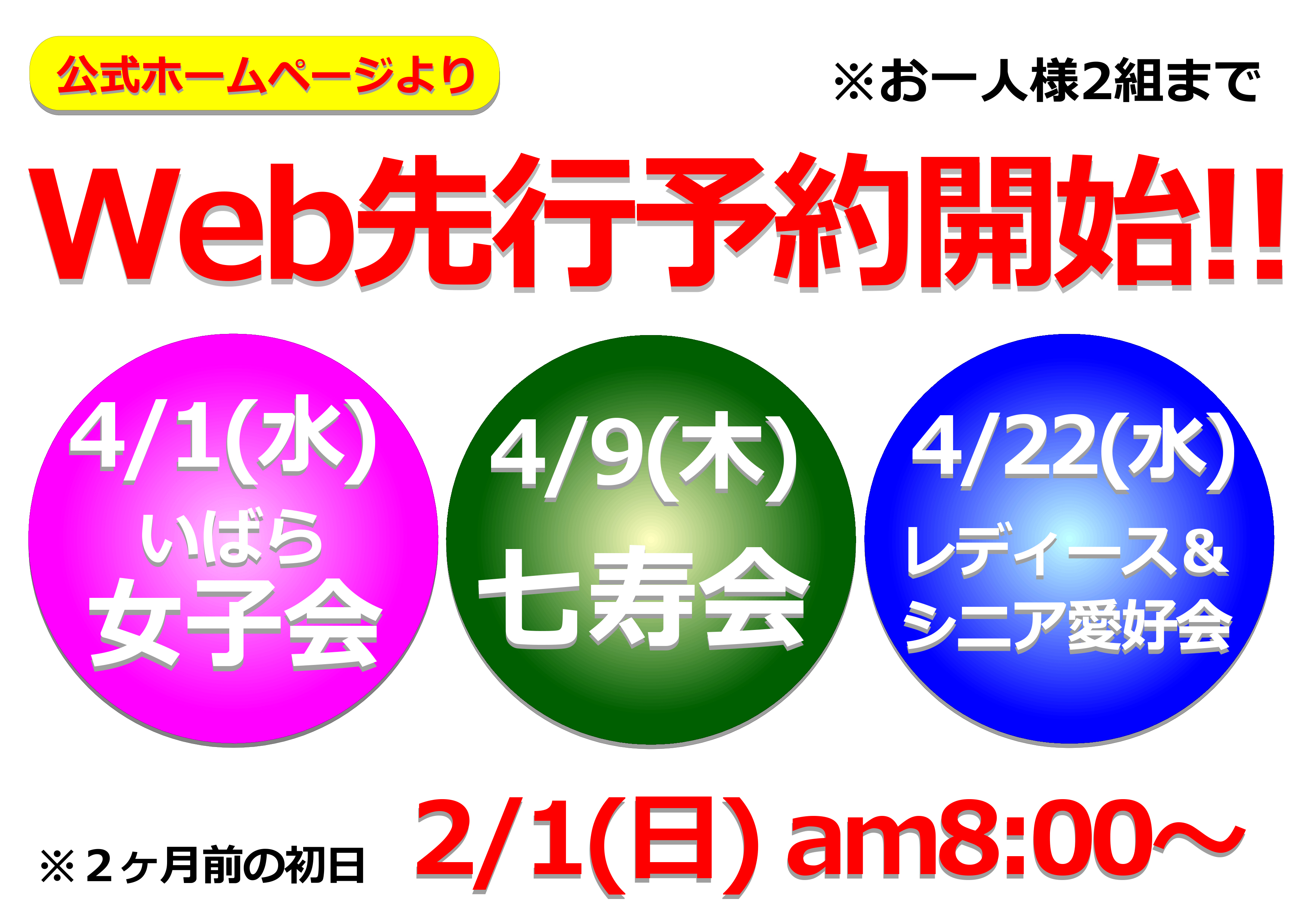 2/1 am 8:00~ Web先行予約開始(4月いばら女子会・4月七寿会・4月レディース&シニア愛好会)