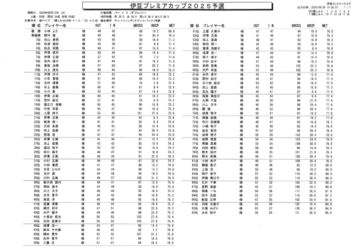 🏆伊豆プレミアカップ2025予選🏆 結果発表 Posted on 2025年9月30日 By 伊東カントリークラブPosted in ニュース 9月13日(土)~9月28日(日)に行われました、伊豆プレミアカップ2025の予選結果を発表いたします。 入賞された方には賞品がございますので、順次お渡し、発送をさせていただきます。 たくさんのご参加、誠にありがとうございました。 今後とも、当クラブをご愛顧賜りますようお願い申し上げます。