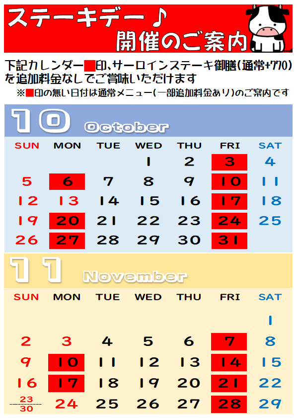 10月・11月ステーキデーのご案内 Posted on 2025年10月2日2025年10月2日 By 伊東カントリークラブPosted in イベント, ニュース こんにちわ、伊東カントリークラブです ⛳ 10月・11月の昼食ステーキフェアのお知らせでございます。 どうぞご賞味くださいませ。